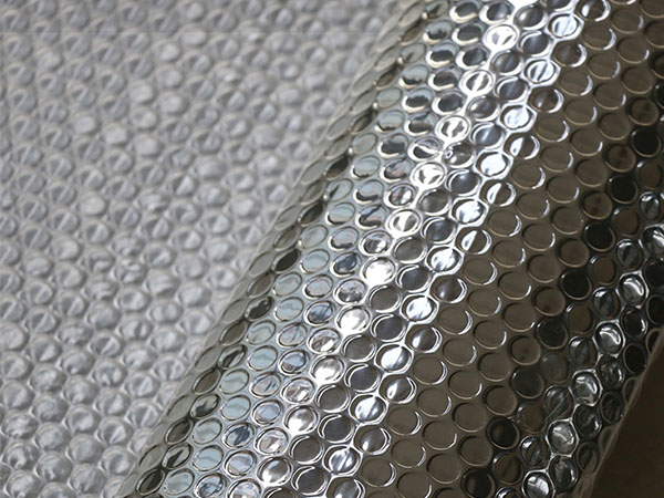 氣泡膜復(fù)鋁膜通過鍍鋁膜材料反光、阻熱的特性和聚乙烯材料的絕緣隔熱結(jié)合,使其不僅具有良好的絕緣、熱反射、隔熱功能。而且在房屋建筑應(yīng)用上能起到很好的防潮、保溫、節(jié)能作用?砂惭b于屋頂、墻壁或者地板,對建筑物起到于外界80%以上熱能量阻隔作用,保護(hù)墻壁,抵擋溫度急增驟降等功效。